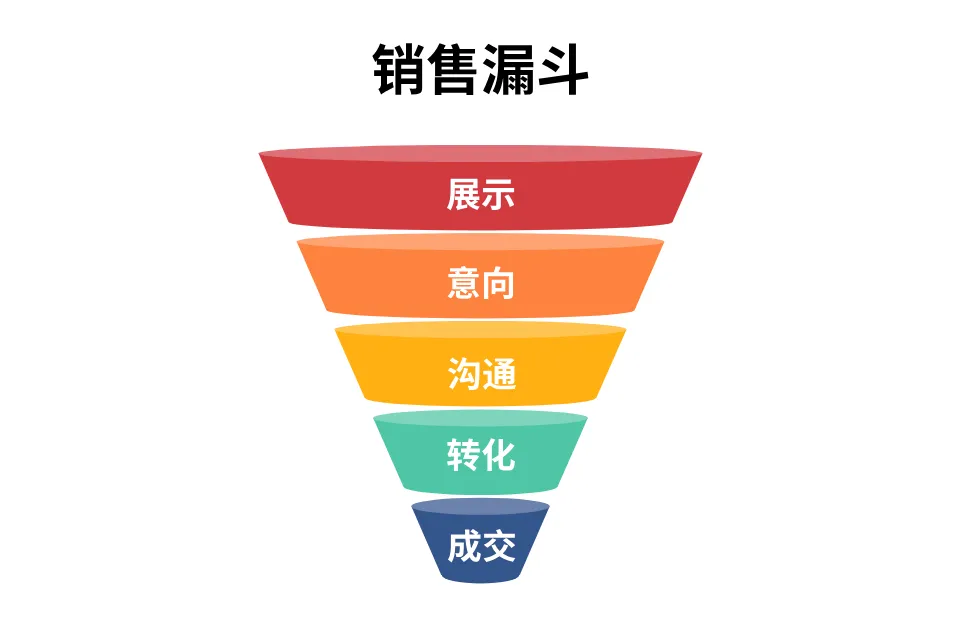 在销售漏斗中的每个层级代表销售过程中的每个阶段,呈现的效果跟漏斗一样,上大下小,每个层级的转化率影响下层的客户量和最终的转化量。